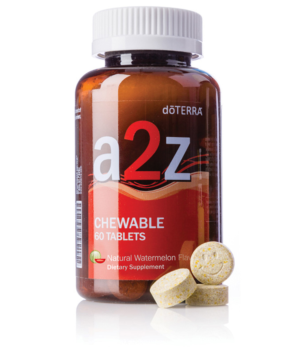 doTERRA a2z Chewable is a proprietary formula of ingredients developed with children and adults who have difficulty swallowing capsules in mind. Combining a blend of B vitamins with a blend of vitamins A, C, and E, as well as botanical extracts, doTERRA a2z Chewable supports healthy cell development and longevity when taken daily.* doTERRA a2z Chewable is formulated to be used with doTERRA Wild Orange-flavored IQ Mega™ Omega-3 fish oil as a comprehensive dietary supplement that supports healthy immunity and cognitive function as well as antioxidant protection.*